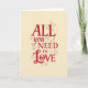 This greeting card shares a warm message with a mix of bold lettering and gentle detail. Centered on a soft cream background, the words “ALL you NEED IS LOVE” stand out clearly. “ALL” and “NEED” are written in strong red block letters that give the message weight and confidence. The words “you” and “IS” are shown in a thinner, flowing script, adding a more personal feel. Across the lower half, the word “Love” appears larger in red cursive, drawing the eye right away. A small red heart replaces the “o,” and delicate red swirls frame parts of the text. It’s a thoughtful card for sharing affection