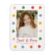Cute holiday photo magnet featuring your vertical photo surrounded by colorful gumdrops. The phrase "Sweet & Merry" is displayed in red brush script lettering with your name and the year shown below. The photo Christmas magnet is perfect to show off your child's photo or a cute photo of your pet(s)!