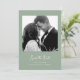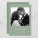 This simple and stylish, sage green wedding save the date card features whimsical, ivory vintage style script typography with your photo and a scannable QR code for your wedding website or details.