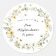 Bee-themed Wildflower baby shower sticker featuring a delicate watercolor wreath of greenery and yellow wildflowers with buzzing bees. Personalise with your information or click "Click to customise further" to edit font styles, size and colours.