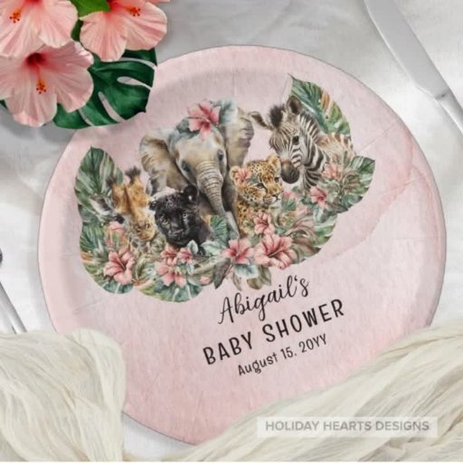 A collage of sweet wild safari jungle baby animals -- giraffe, zebra, panther, tiger and elephant -- are nestled cozily among the tropical hibiscus and monstera greenery in this Baby Shower design. Background is a gradient pink watercolor.Composite design by Holiday Hearts Designs.