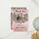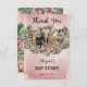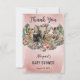 A collage of sweet wild safari jungle baby animals -- giraffe, zebra, panther, tiger and elephant -- are nestled cosily among the tropical hibiscus and monstera greenery in this "Thank You" Baby Shower design. Background is a gradient pink watercolor. Back features two corner tropical swags over a repeat of the front watercolor background and your unique message. Composite design by Holiday Hearts Designs.