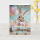 A happy baby bunny sits at her birthday table beside a pastel cake with a glowing candle, surrounded by balloons, gifts, and festive decorations. With bright, cheerful lettering that reads “Happy 1st Birthday, Sweet Baby Girl,” this adorable design captures the joy, innocence, and excitement of a baby girl’s first birthday celebration. A perfect choice for a fun and heartwarming milestone card.