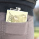 This flask displays a sweet baby lamb just three weeks old. He is munching on grass against a yellow background.