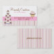 Pretty bakery business card done with graphic artwork of a whimsical pink, brown, and white striped pattern, on the bottom and back of the card. A pink cupcake and a wedding cake decorate the front of the card. Personalise the text for your bakery business. Great for at home bakers too.