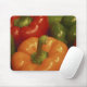 Colourful photograph of yellow, red and green sweet bell peppers on a mouse pad.