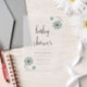 Sweet vellum baby shower invitation features beautiful blue floral and gold colour confetti illustrations. Modern brush lettering script adds a playful detail. This pretty translucent invitation can be layered over a photo card or rsvp enclosure sold separately.