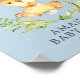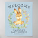 Cute welcome baby shower poster featuring the sweetest baby bunny set on a blue background for a baby boys shower.