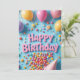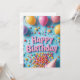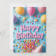 This bright and cheerful birthday card features the words “Happy Birthday” in bold pink letters surrounded by colourful balloons, lollipops, confetti, and a playful cone-shaped party hat. A cascade of vibrant candy spills across a fun blue background, creating a joyful and festive vibe. Perfect for kids, sweet tooth lovers, or anyone who enjoys fun, candy-themed celebrations and bright party energy.