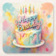 A vibrant, pastel-coloured birthday cake with a playful twist, featuring a colourful " Happy Birthday " sign and a whimsical design that's sure to delight. The cake's pink, blue and yellow hues are perfectly complemented by the splattered paint background, creating a fun and lively atmosphere.