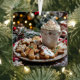 A sweet Christmas ornament with a photo of gingerbread men, Christmas cookies and hot cocoa with whipped cream and a festive background.