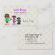 Whimsical mummy play date calling card, done in a light tan and ivory polka dot pattern. Cartoon graphics of three dark skin kids, in colourful clothing, decorates the bottom left. Personalise the text, on the front and back, for yourself, as a mummy card, or for your child. Great way to stay in touch with other moms and arrange play dates, birthday parties, and baby sitting co-ops.