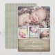 Casual and elegantly rustic, this beige burlap background and stylish typography sets the stage for an lovely country birth announcement for your new baby boy. With room for a multi photo collage of your child, this card is a lovely way to introduce baby to family and friends. Coordinating burlap and blue striped pattern on the back.