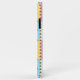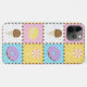 Satisfy your sweet tooth with this colourful pattern featuring tasty treats like a chocolate ice cream cone, a purple frosted chocolate doughnut, a lemon yellow macaron, and a pink and white swirled lollipop separated by chocolate chips and surrounded by rainbow sprinkles on four brightly hued squares. This design will work on cases to fit a variety of phone models.