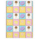 Satisfy your sweet tooth with this colourful pattern featuring tasty treats like a chocolate ice cream cone, a purple frosted chocolate doughnut, a lemon yellow macaron, and a pink and white swirled lollipop separated by chocolate chips and surrounded by rainbow sprinkles on four brightly hued squares.