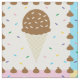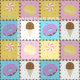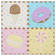 Satisfy your sweet tooth with this colourful pattern featuring tasty treats like a chocolate ice cream cone, a purple frosted chocolate doughnut, a lemon yellow macaron, and a pink and white swirled lollipop separated by chocolate chips and surrounded by rainbow sprinkles on four brightly hued squares.