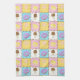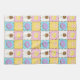 Satisfy your sweet tooth with this colourful pattern featuring tasty treats like a chocolate ice cream cone, a purple frosted chocolate doughnut, a lemon yellow macaron, and a pink and white swirled lollipop separated by chocolate chips and surrounded by rainbow sprinkles on four brightly hued squares.