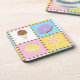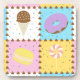 Satisfy your sweet tooth with this colourful pattern featuring tasty treats like a chocolate ice cream cone, a purple frosted chocolate doughnut, a lemon yellow macaron, and a pink and white swirled lollipop separated by chocolate chips and surrounded by rainbow sprinkles on four brightly hued squares.