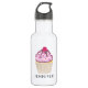 Water bottle personalised with a name with an illustration of a delicious looking cupcake. Pink frosting and chocolate drizzles. A yellow cupcake holder and a raspberry on top. Yummy!