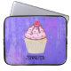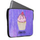 A laptop sleeve with an illustration of a delicious looking cupcake. Pink frosting and chocolate drizzles. A yellow cupcake holder and a raspberry on top. Yummy!