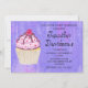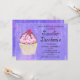 A birthday party invite with an illustration of a delicious looking cupcake. Pink frosting and chocolate drizzles. A yellow cupcake holder and a raspberry on top. Yummy! The background is a purple abstract texture with little hearts peppered throughout.