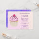 A birthday party invite with an illustration of a delicious looking cupcake. Pink frosting and chocolate drizzles. A yellow cupcake holder and a raspberry on top. Yummy! The back sidehas a purple abstract texture with little hearts scattered around.