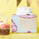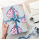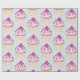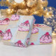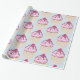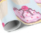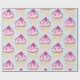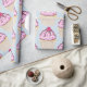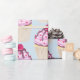 Wrapping paper with an illustration of a delicious looking cupcake. Pink frosting and chocolate drizzles. A yellow cupcake holder and a raspberry on top. Yummy!