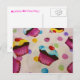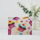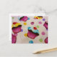 yellow,pink and blue icing choc. cupcakes fill this post card with matching birthday invites and postage stamps.
