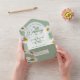 The simple country daisies exude a sense of natural beauty and innocence, symbolising the purity and joy of your love. Against the calming sage green backdrop, they create a picturesque scene that captures the essence of a serene countryside wedding. The All-in-One wedding invitations are both beautiful and practical by combining the wedding invitation with an easy to remove perforated RSVP postcard. They are also quick and easy to prepare for mailing. Simply address the invitation, fold the back flap and seal with the included clear stickers. Once your guests receive the pre-addressed invitation they simply tear off the perforated RSVP card and drop it in the mail.