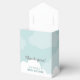 A lovely stork-themed baby shower favour box that features a lovely teal blue, grey and white colour scheme. A happy stork glides by carrying a new little bundle of joy as he flies against a soft aqua blue sky that's dotted with puffy clouds. A traditional symbol is given an updated look in this thoroughly modern take on the theme with original illustration and trendy, whimsical typography.