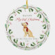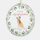 This sweet dog ornament features "my first Christmas in my forever home" typography with pretty red script. Your pet's name is prominent at the top of the design, and is surrounded by a festive botanical and berry painted wreath. The ornament includes a cute golden retriever illustrated dog in the centre. A beautiful gift for any fur parent!