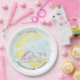A charming watercolor illustration of a baby elephant peacefully sleeping on a crescent moon, surrounded by fluffy clouds and twinkling pastel stars. The soft colour palette of yellows, blues, and pinks creates a dreamy and whimsical atmosphere, perfect for a baby shower invitation. Ideal for a gender-neutral or baby girl celebration, this design evokes warmth, love, and the anticipation of welcoming a new little one.