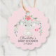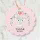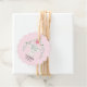 Cute elephant baby shower favour tag set on a pink background.