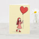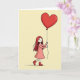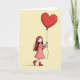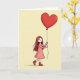 This sweet card shows a young girl walking happily across a soft, creamy yellow background. Her bright red hair flows around her smiling face, drawn with simple dot eyes and a gentle curved smile that captures pure joy. She wears a soft pink dress and bold red boots that echo the color of her hair, helping her stand out. In her hand, she holds the string of a large heart-shaped balloon floating above her, becoming the centerpiece of the scene. A faint shadow beneath her feet adds depth and balance. The warm colors and gentle lines create a feeling of innocence, hope, and love, making this card a lovely way to share Valentine’s Day warmth. ❤️