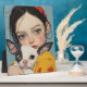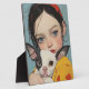 Bring a touch of whimsical artistry to your space with this striking portrait frame featuring a unique illustration of a young girl and her Chihuahua. The artwork captures an intimate moment between a blue-eyed girl with a red hair bow and her black and white Chihuahua companion against a serene blue background.