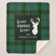 Cute home sweet home Christmas blanket you can easily customise by clicking the "Personalise" button, Featuring deer silhouette and clan Davidson tartan in green chequered pattern.