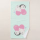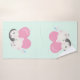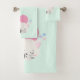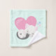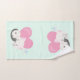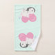 Towels with an adorable graphic illustration. A white kitty cat with a cute paw print image on her fur. Sleeping peacefully. A big pink heart behind her and some little stars too. Mint green background.