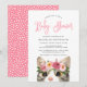 Cute, cat-themed baby shower invitations featuring a pink modern calligraphy script and a painted watercolor cat with pink and mauve flowers. Personalize the kitten-themed baby shower invitations by adding the mother's name and shower details. The invites reverse to display pink and white dot pattern.