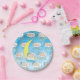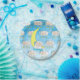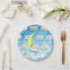 A hand drawn little baby boy, with faded blue background with baby sleeping on the moon and on clouds with yellow stars hanging down. Adorable boy's baby shower paper plates.