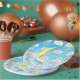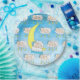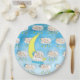 A hand drawn little baby boy, with faded blue background with baby sleeping on the moon and on clouds with yellow stars hanging down. Adorable boy's baby shower paper plates.