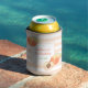 Kids birthday can cooler features cute watercolor peaches on peach colour stripes background.
