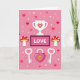 This Valentine's Day card shows a pink background filled with small white sparkles and tiny heart details that make the scene feel sweet and romantic 💕. In the center, there’s a bright white trophy with a pink-and-yellow heart on the front, like love is the top prize. Just below it, a framed sign says “LOVE” in simple, easy-to-read letters, with a dark magenta border around the word. On each side of the sign, two red mushrooms sit like little decorations, each topped with white heart spots. At the bottom, a pink heart-shaped padlock with a golden keyhole rests between two white keys, and each key has a heart shape at the top. The colors stay mostly pink, red, and white, keeping everything focused on romance and caring ❤️. Share it with someone special and let them know you’re thinking of them this Valentine’s Day 😘.