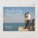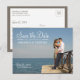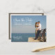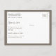 Elegant typography and simple styling of this photo postcard features your engagement photo, and "Save the Date" info in white text on the left side of the front. Soft neutral grey/brown colour on the back with space for all the important details; wedding date, website and a personal message. Perfect for an offset portrait.