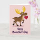 This design shows a sturdy brown antlered animal centered on a soft blush-pink background, stepping forward with one front leg lifted as if approaching someone it likes. Its golden-yellow antlers spread wide above its head, and its big eyes and small upturned mouth give it a friendly, affectionate look ❤️. In its mouth, it carries a heart-shaped bouquet of deep red roses, the green stem angled gently to one side like an offering meant for a dear friend. The simple setting keeps the focus on that tender gesture, as if the animal is delivering flowers on a special day 🌼. Beneath the figure, a short greeting appears in purple lettering, placed low and centered under the hooves. The words read “Happy Moosether’s Day,” with the text standing out clearly against the pink space. The roses are clustered into a heart shape, with layered red petals and a single green stem trailing down from the animal’s mouth.