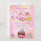 Sweet One desserts theme girly colourful 1st Birthday invitation, with cupcakes, doughnuts, cake, and other sweets, designed with hand-drawn elements in pastel pink, purple, teal, and faux gold colours with faux gold glitter elements.