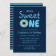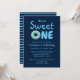 He's a Sweet One, 1st birthday invitation. Cute blue doughnut, and blue script typography. Back of card features coordinating blue stripe pattern.