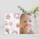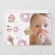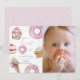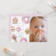 This cute "she's a sweet one" girl's 1st/first birthday photo invitation features doughnuts, cupcakes, and an ice cream in pastel pink shades. The reverse side features a light pink background with sprinkles. Personalise it for your needs. You can find matching products at my store.