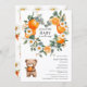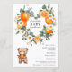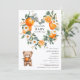 Celebrate the upcoming arrival of your little one with this enchanting baby shower invitation! Featuring a whimsical watercolor design, it showcases a charming teddy bear holding a juicy orange, surrounded by a vibrant heart-shaped wreath of oranges, daisies, and lush greenery. The gentle color palette and playful illustrations create a warm and inviting atmosphere for your special event. This invitation is perfect for announcing a 'Sweet Little Baby is on the Way!' and will set a delightful tone for your baby shower guests. The back of the invitation features a repeating pattern of daisies with orange bows, adding an extra touch of charm.