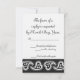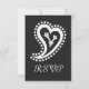 This elegant RSVP card features a black background and a large paisley shaped heart, surrounded by polka dots with a vine on the interior, in white on the front. A black border along the bottom edge of the card with a pattern of white paisley hearts decorates the back with some sample text in place above that can be customised to fit your needs.