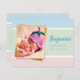 Celebrate the arrival of your new little boy with this sweet custom note card. Card features a photo of your baby outlined in faux gold foil. To the right of the photograph is baby's name, date of birth, weight, and length. The background has soft stripes of pastel blue, green, and pink. The back has space for a personalised message, such as the names of the happy parents and siblings.